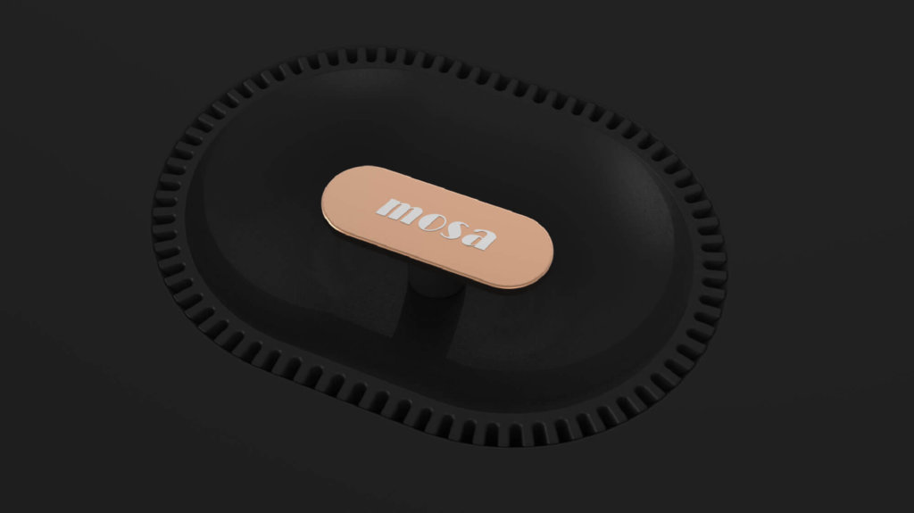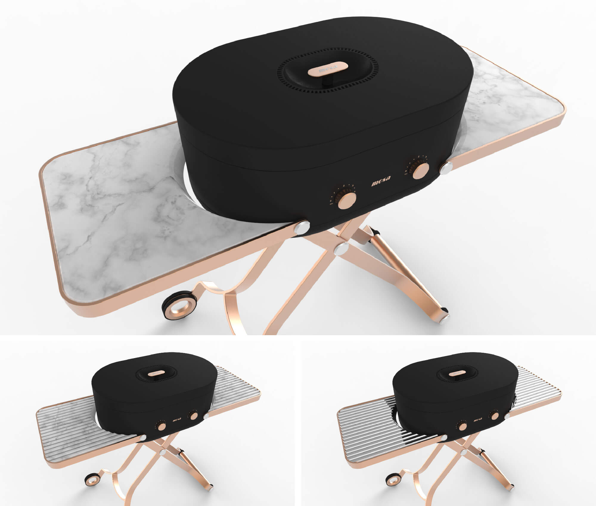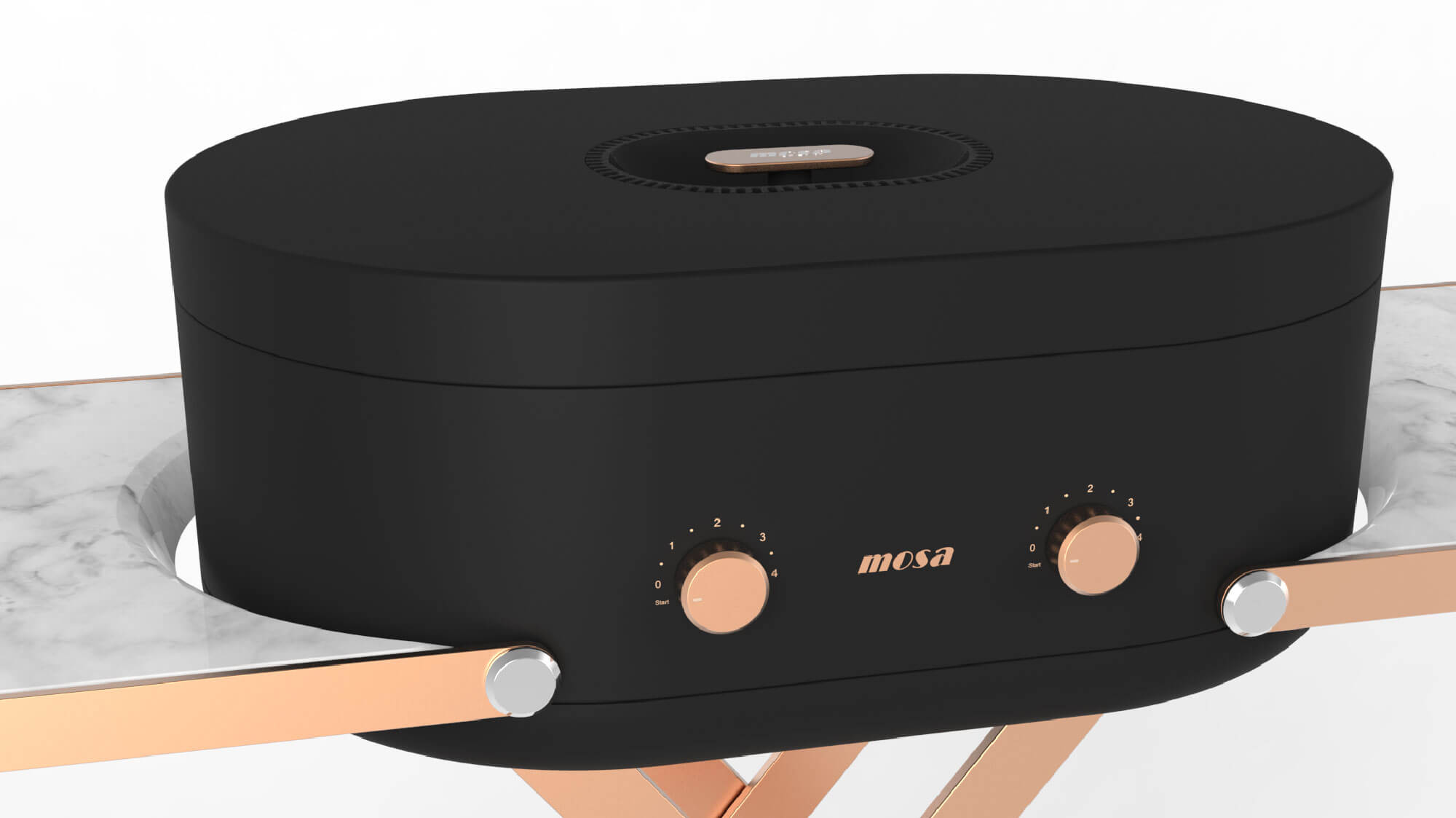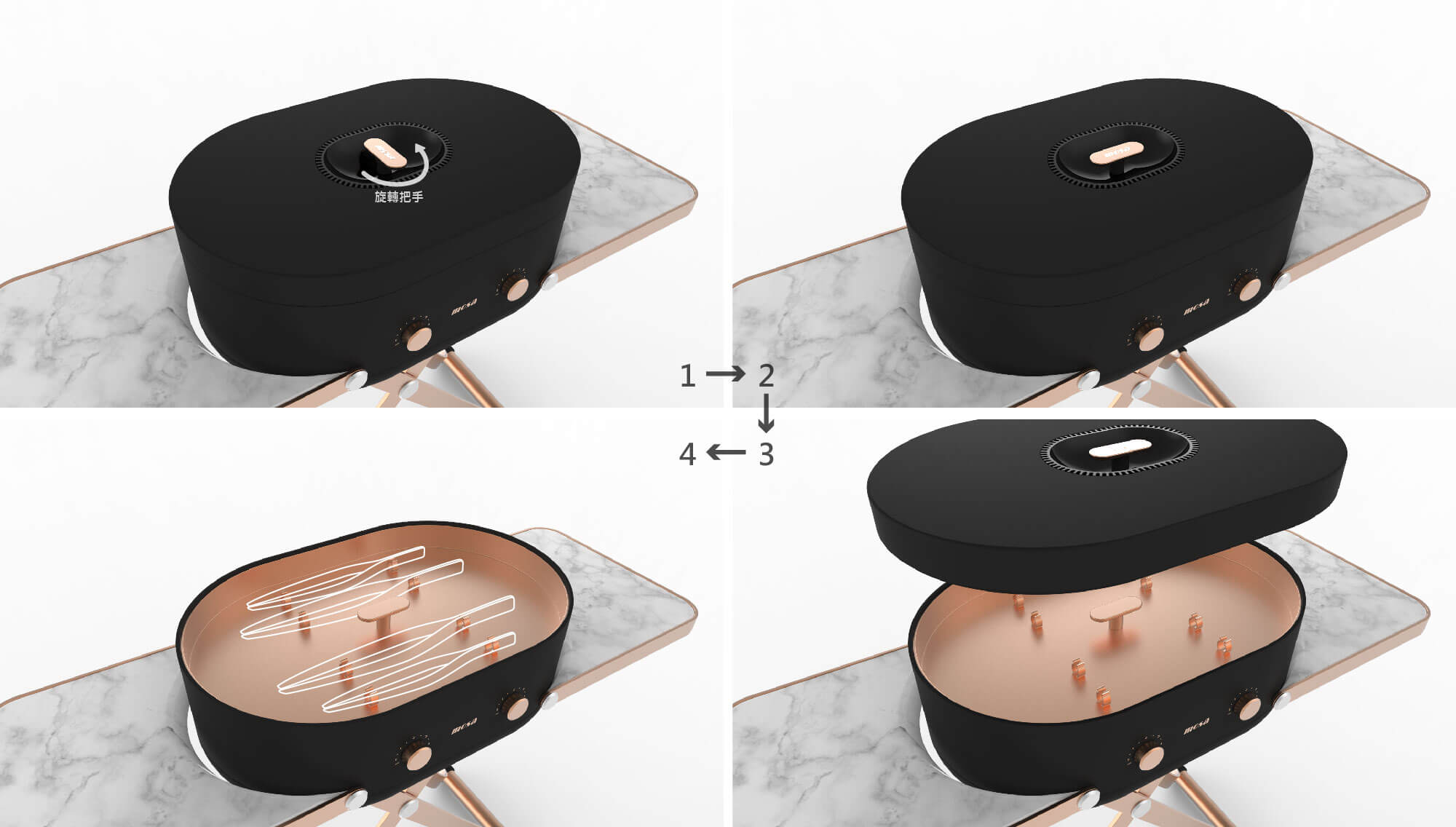 烤爐頂端是一個玫瑰金的爐蓋把手 , 下方是下凹球面的黑色隔熱塑膠 , 防止燙傷 ,其週邊還設計有格狀散熱孔 .
