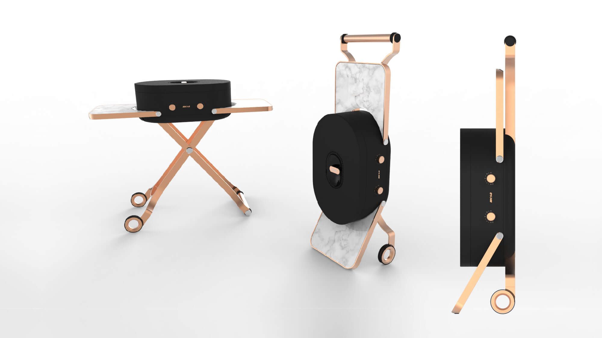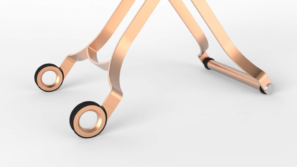 腳架使用鋁合金陽極玫瑰金 , 由呼應主體的線條在下方展開 , 增強穩定性 ,