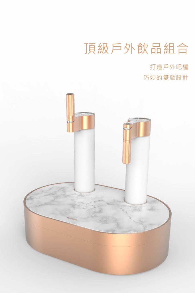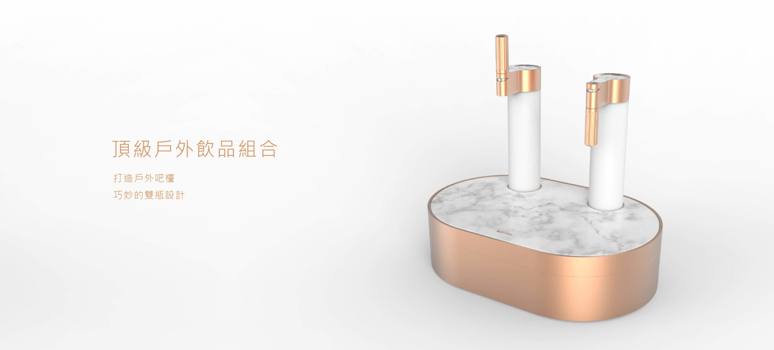 這是一組給頂級消費者 , 外出野餐時 , 攜帶的氣泡飲料組合 . 其包含了兩個重要部件 : 收納盒與雙瓶身 . 設計的重點在於 : 如何打造高質感 , 又兼具創新功能 , 去打造良好的使用體驗 , 這裡的體驗包含實體產品與精神上的 . 下面我們用使用者的視角 , 去拆解與說明整個設計的邏輯 .