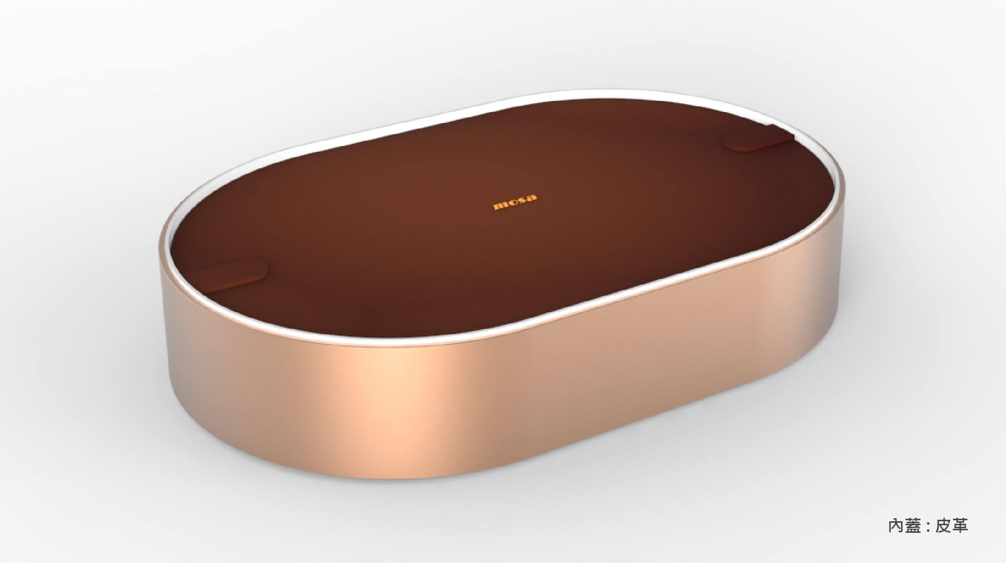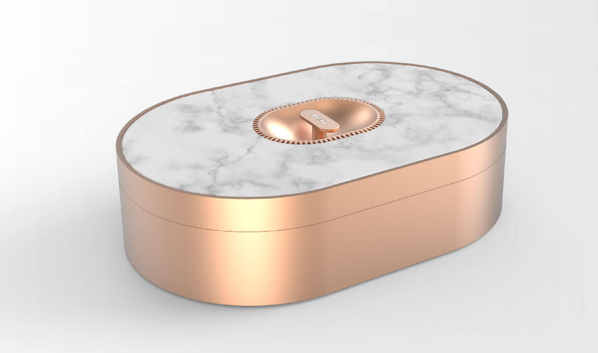 優雅 , 圓潤的玫瑰金鋁合金外殼 , 上表面鑲一塊白色紋理大理石 . 整體端莊 , 並帶有新時代的貴氣 .
