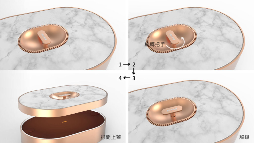 把手也是開關 . 轉動把手 , 即可姐鎖 , 往上提起 , 打開上蓋 , 只需一個連續動作 .