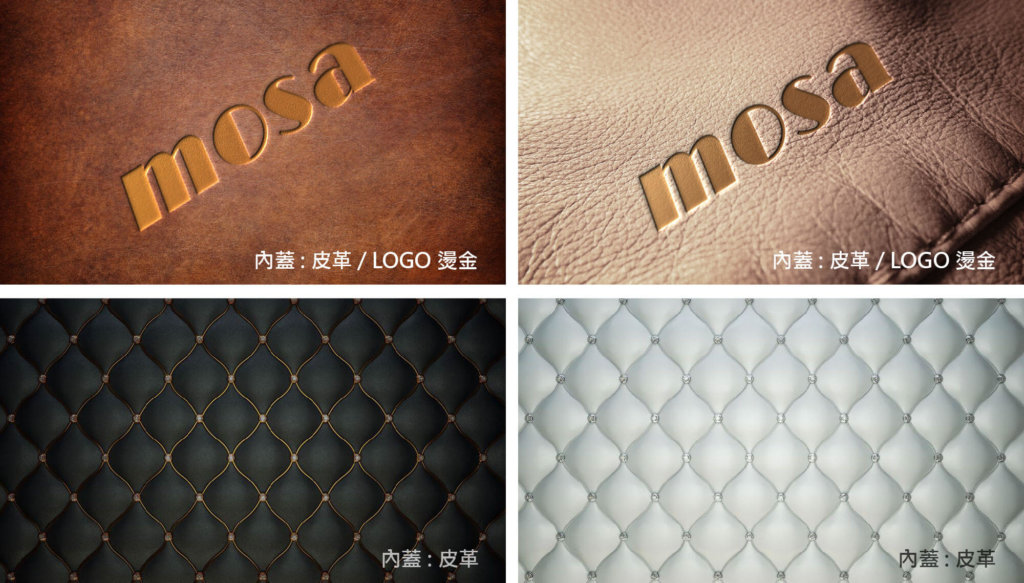 皮革內蓋提供多種選項 , 有強調皮革本身質地的 , 在表面做 LOGO 的燙金處理 . 也有歐式鑲鑽的菱格皮面 .