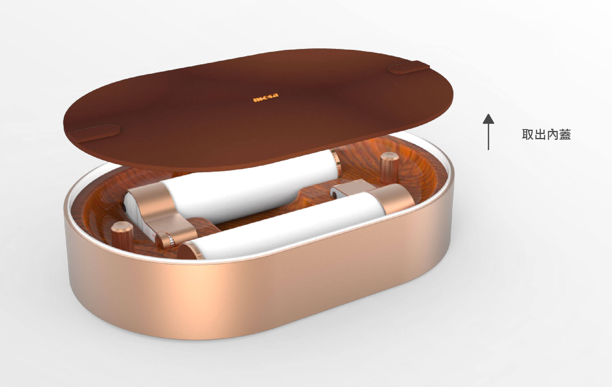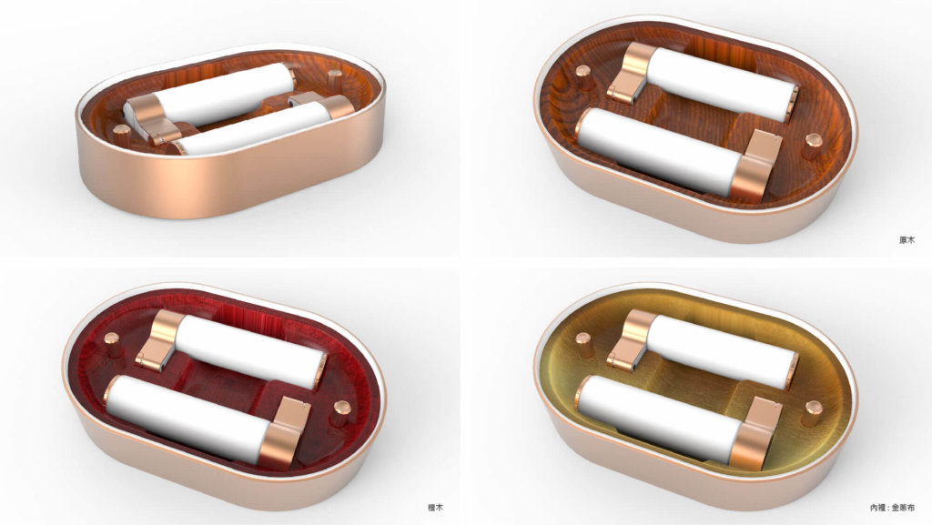 瓶身躺在有瓶身凹面的下底蓋中 , 下底蓋也提供了 2 種顏色的原木 , 與金色絨布的選擇 , 有一種豪車內裝的質感 .