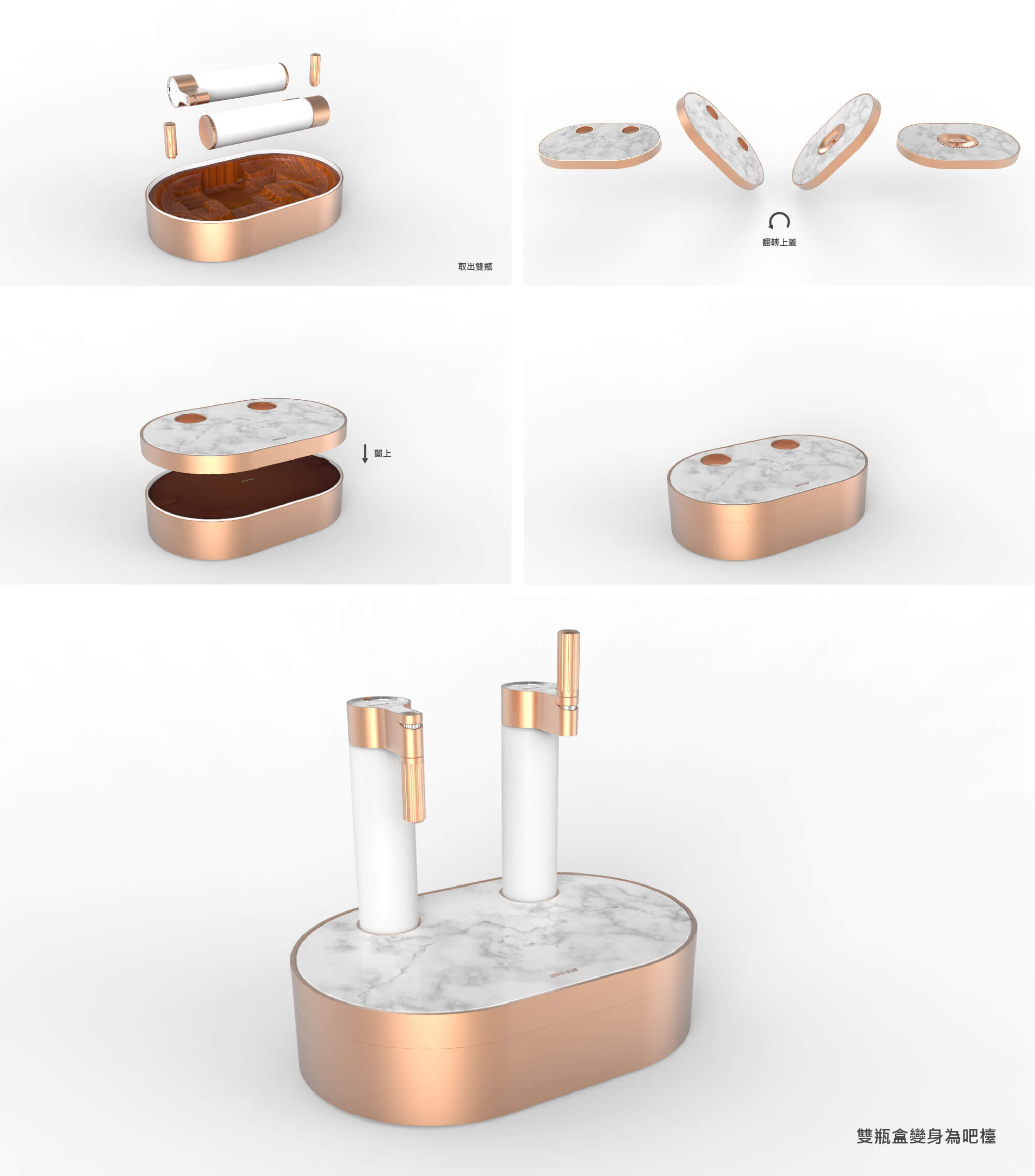 取出雙瓶後 , 翻轉上蓋 , 合回下底蓋 . 將雙瓶插入檯面上兩個凹洞 , 即變身為行動吧台 .
