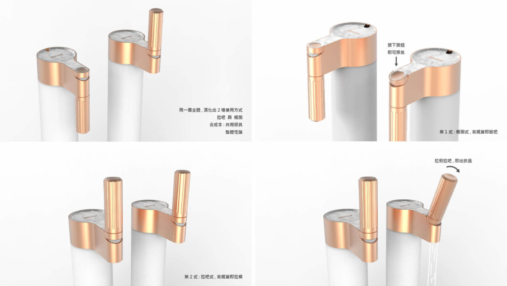 業者對於瓶身出飲料或酒精性飲料 , 有 < 傾倒 > 與 < 拉霸 > 兩種需求 . 原本的設定是開發兩種瓶身 , 但我們透過設計 , 將兩種功能整合在同一個瓶身上 , 透過變化小鋼瓶的固定位置 , 就可以完成兩個功能的轉換 .