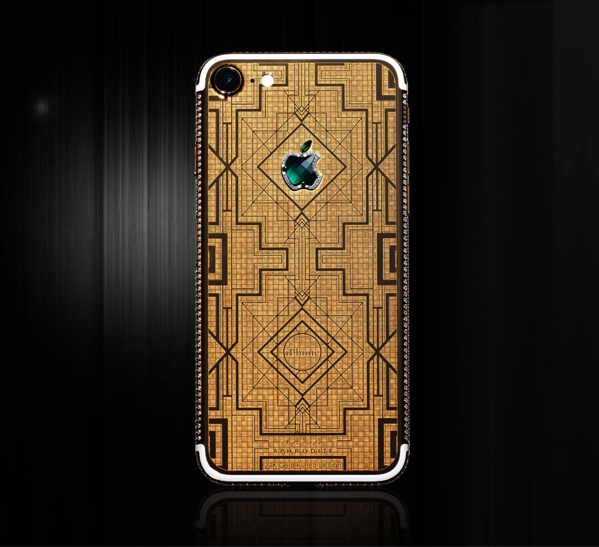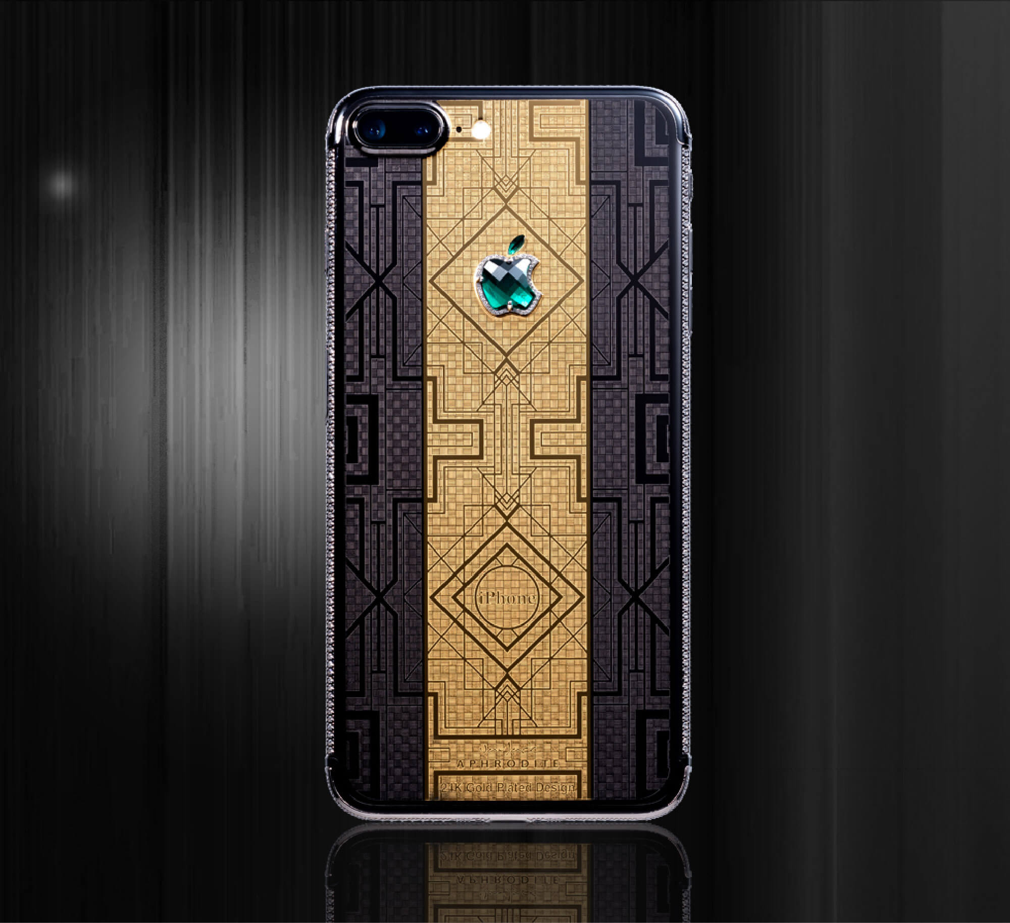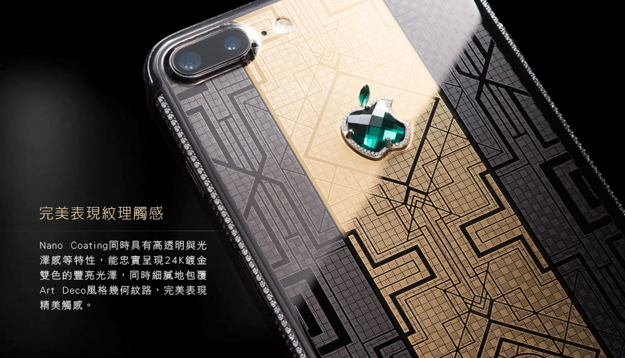 背面使用鐳射雕刻 , 雕上華麗的 Art Deco 經典花紋 . 再鍍上黃金 , 其中一款為雙色鍍金 . 整機四週為 266 顆透明水晶 , 中間點綴一顆祖母綠 . 打造出優美的視覺層次 , 並融入無價之藝術風格 , 打造出這款奢華 iPhone .