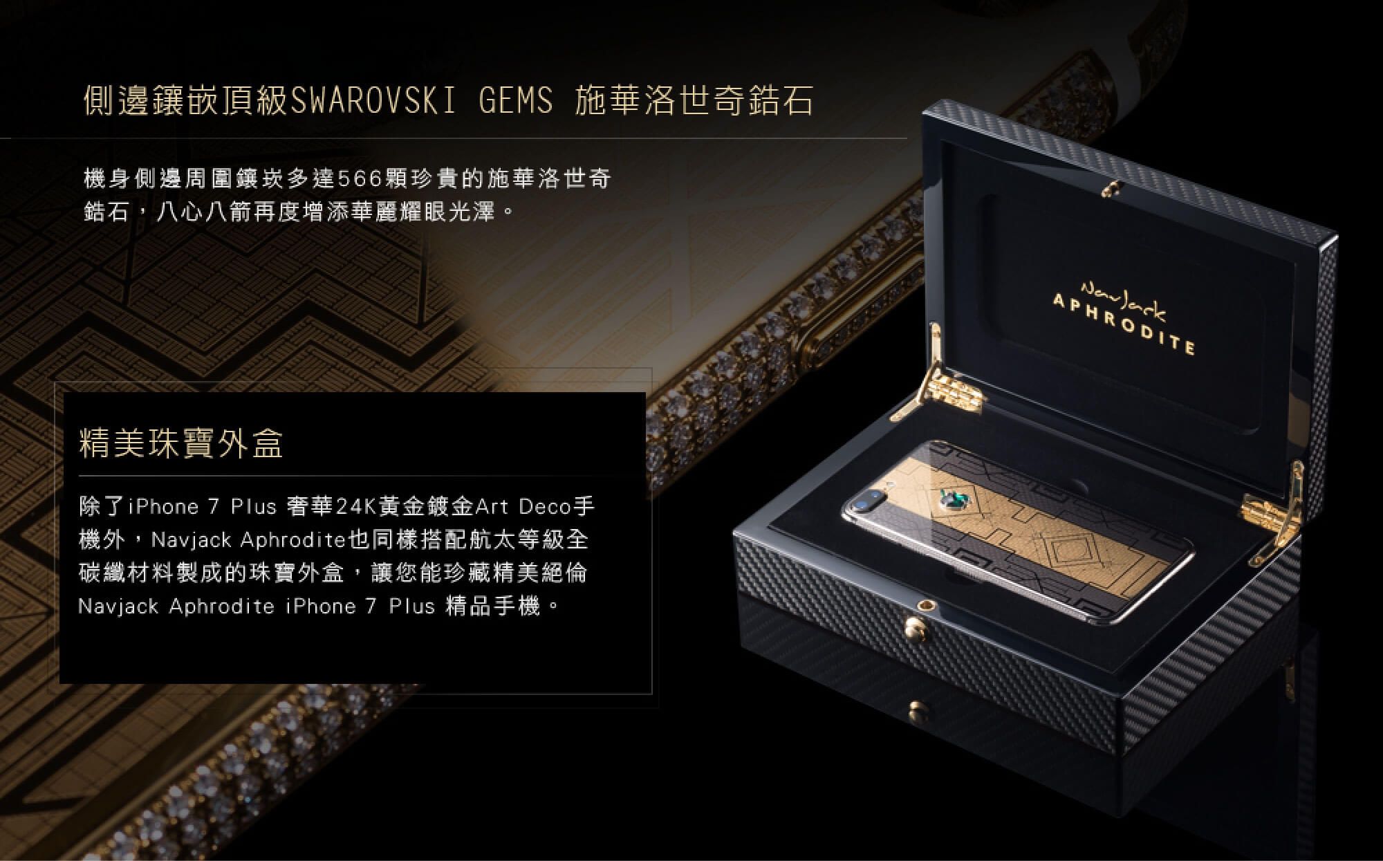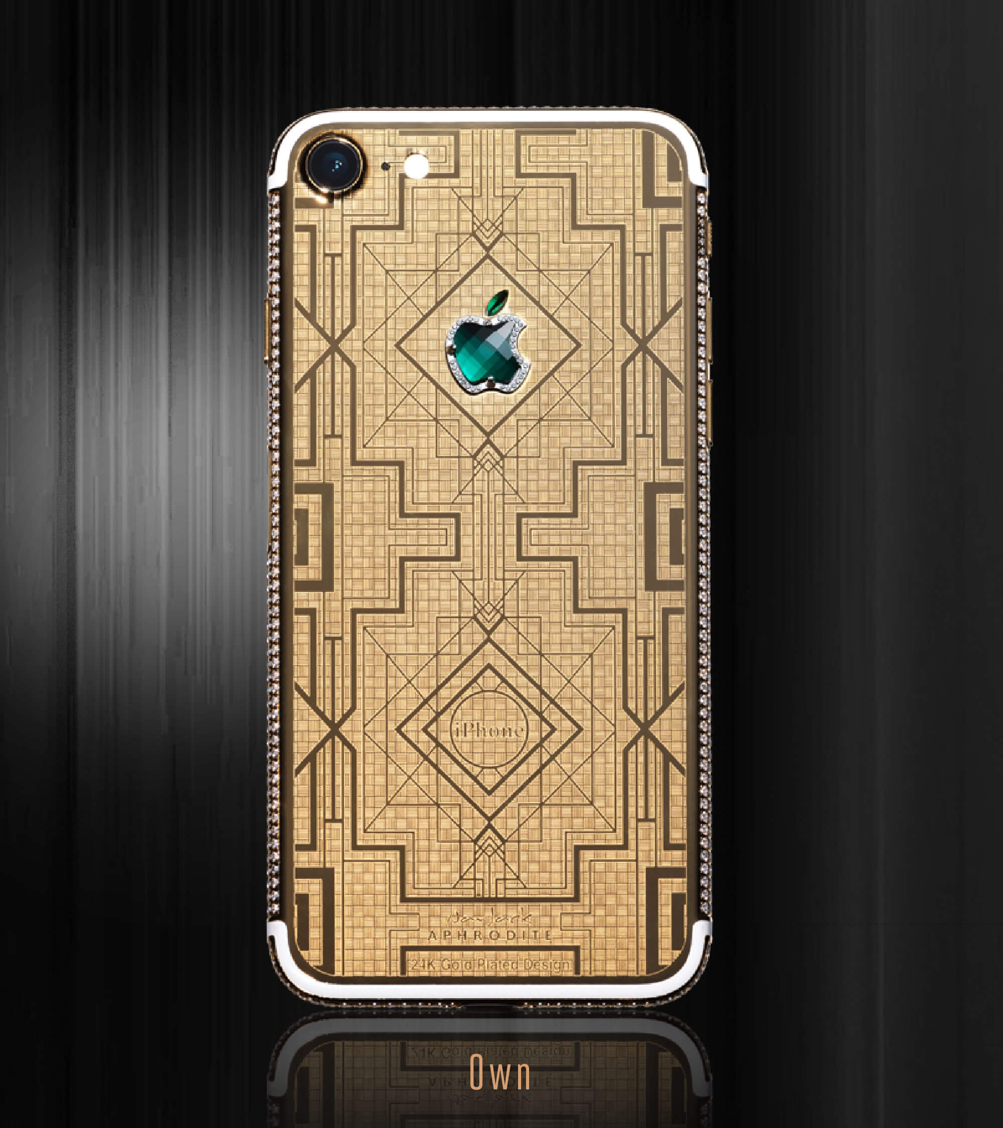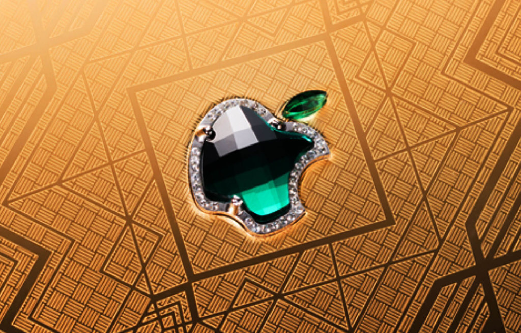 背面使用鐳射雕刻 , 雕上華麗的 Art Deco 經典花紋 . 再鍍上黃金 , 其中一款為雙色鍍金 . 整機四週為 266 顆透明水晶 , 中間點綴一顆祖母綠 . 打造出優美的視覺層次 , 並融入無價之藝術風格 , 打造出這款奢華 iPhone .
