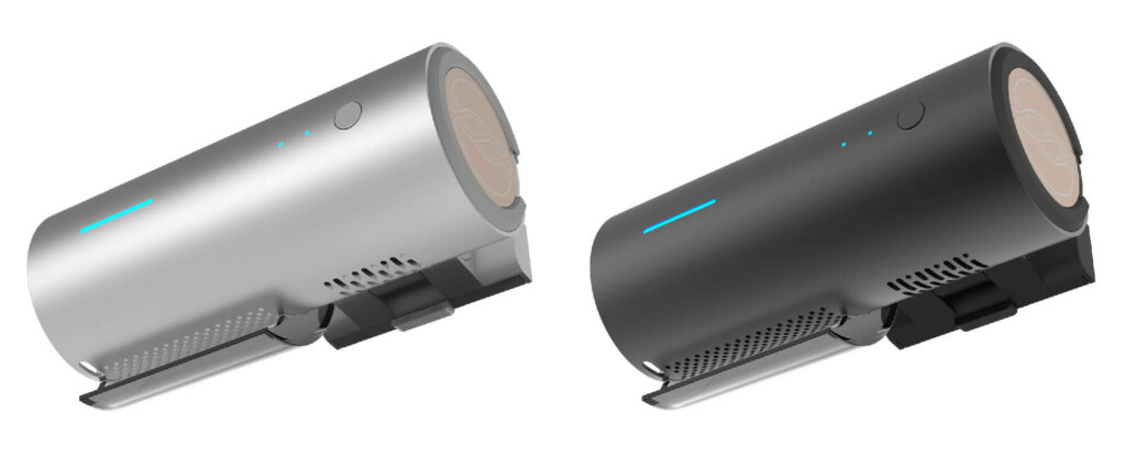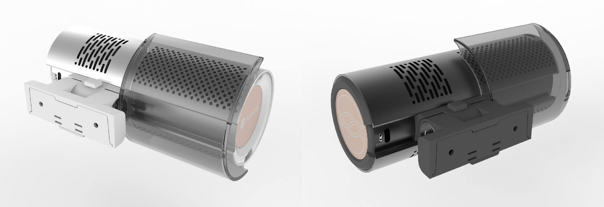 由於機芯是發射出具有殺菌的光線 , 會使透明或清透顏色的塑膠變黃 , 故共用煙燻黑的風罩 .